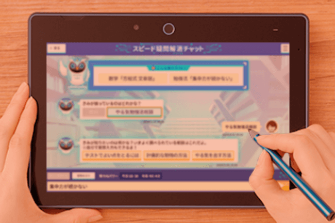 対面で先生に上手に質問できないお子さまも大丈夫。いつでもチャットにつぶやくだけで、AIがお子さまの知りたい内容を予測し、解決へと導きます。