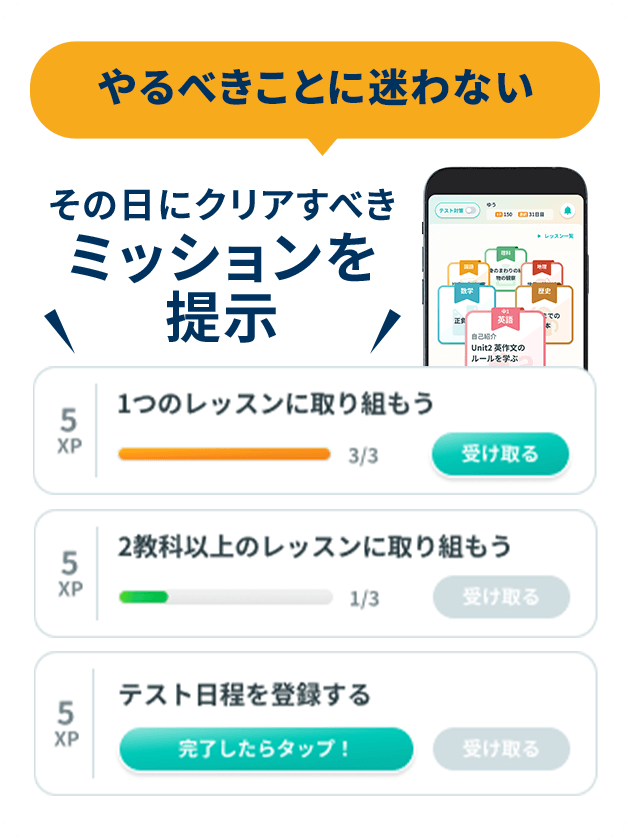 「テスト対策モード」では、得点しやすい順に効率よく学習でき、最短ルートで得点アップを目指せます。