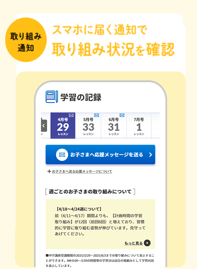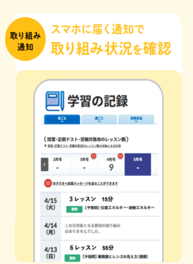 保護者向けの管理画面や通知機能を通じて、お子さまの学習状況や進捗を確認できます。