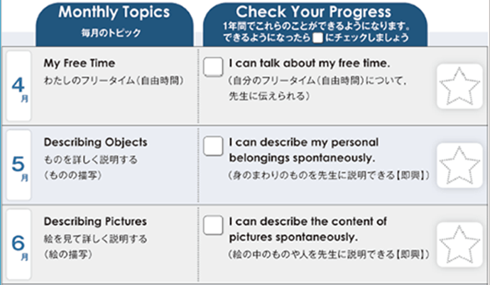 中学卒業までに学習したことを正しく言えるかを確認します。質問を正確に聞き取りイラストの情報を正しく言うことができるか、自分のことについて具体例や経験などを加えて言うことができるかなどを確認します。