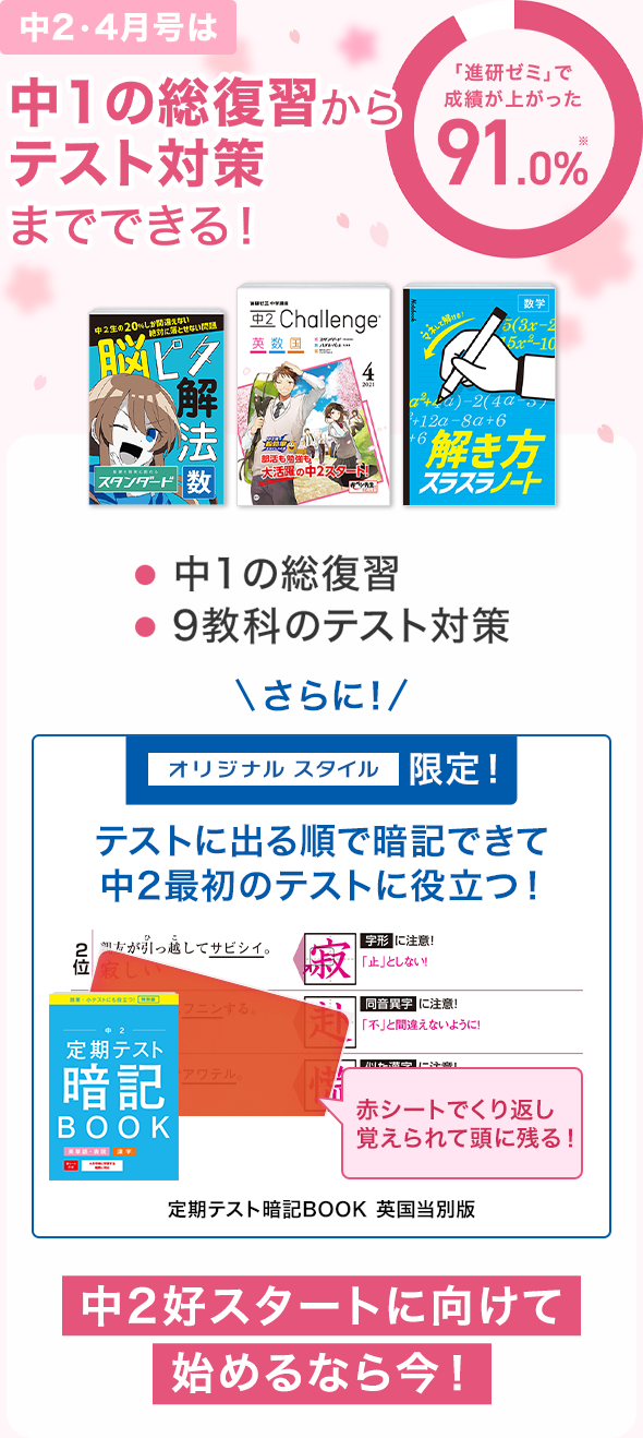 難しくなる中2の学習のために、教科書対応のテキストをお届け。1回15分でできるので、部活と両立できます。